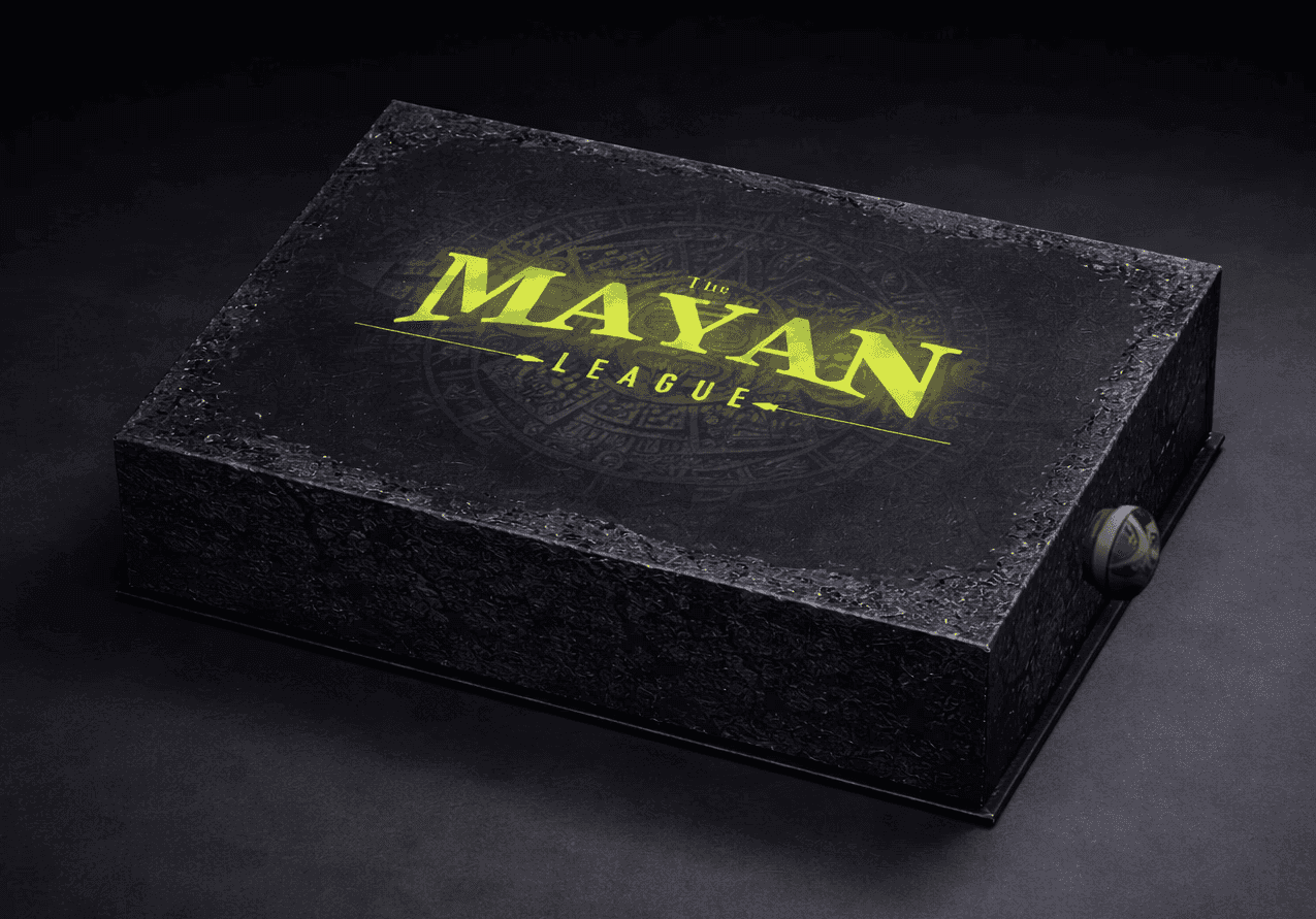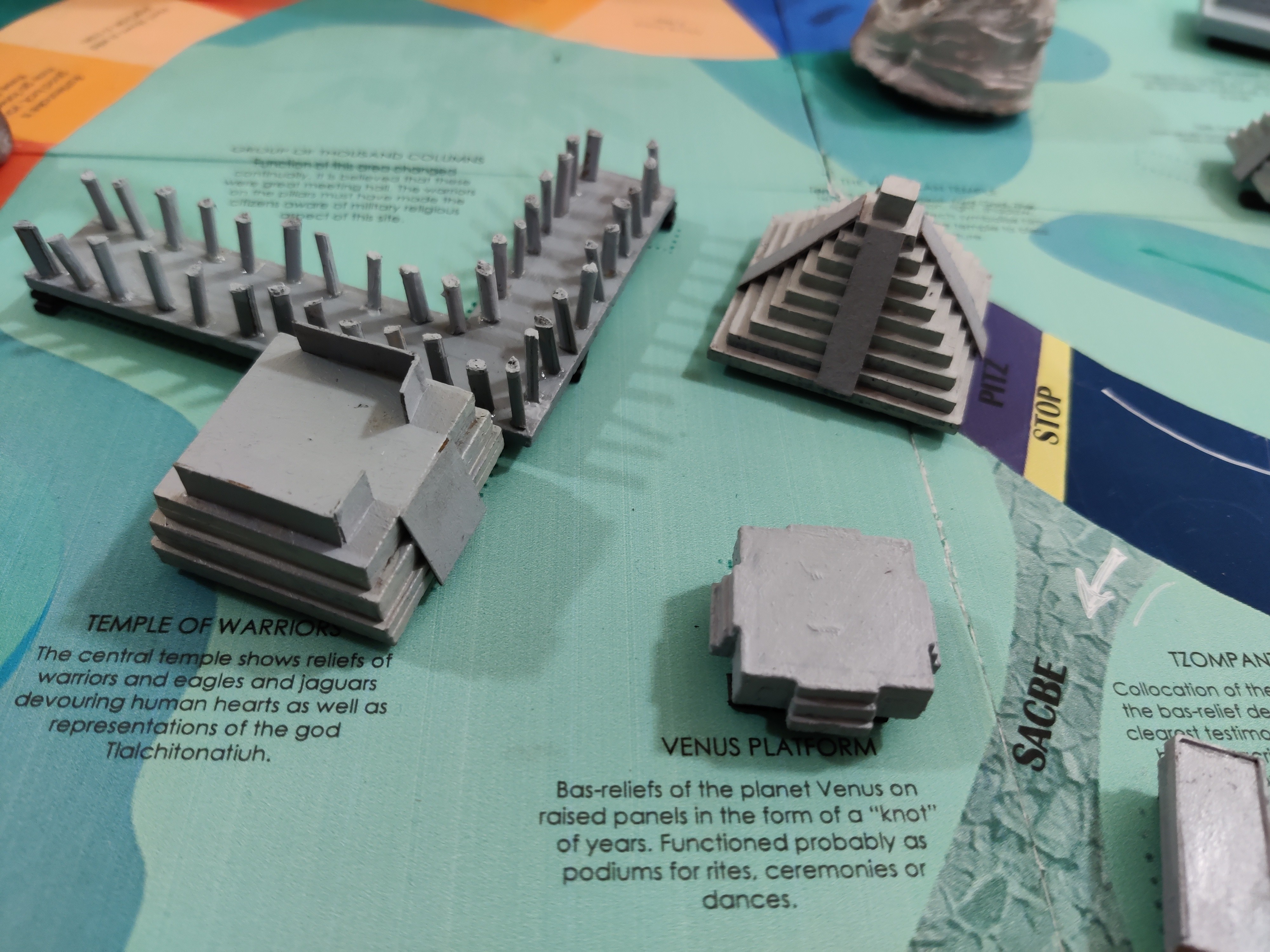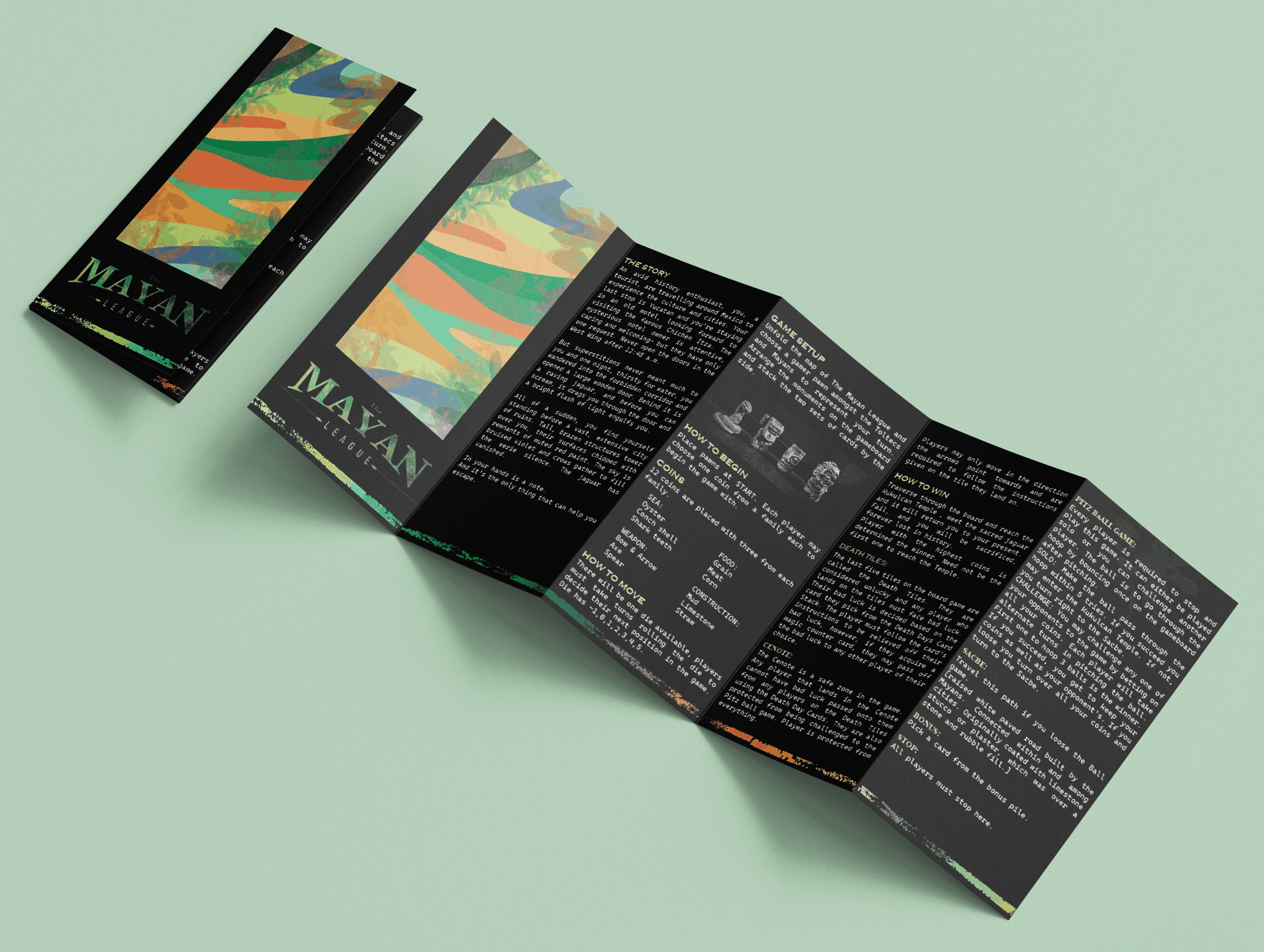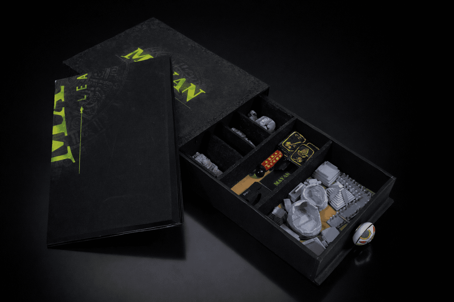 Everything was handmade from scratch using clay, foam board, mill board, paint, magnets, and textured finishes. The final box includes the board, manual, pawns, coins, Mayan die, ball-and-hoop element, two card decks, architectural blocks, and custom packaging.