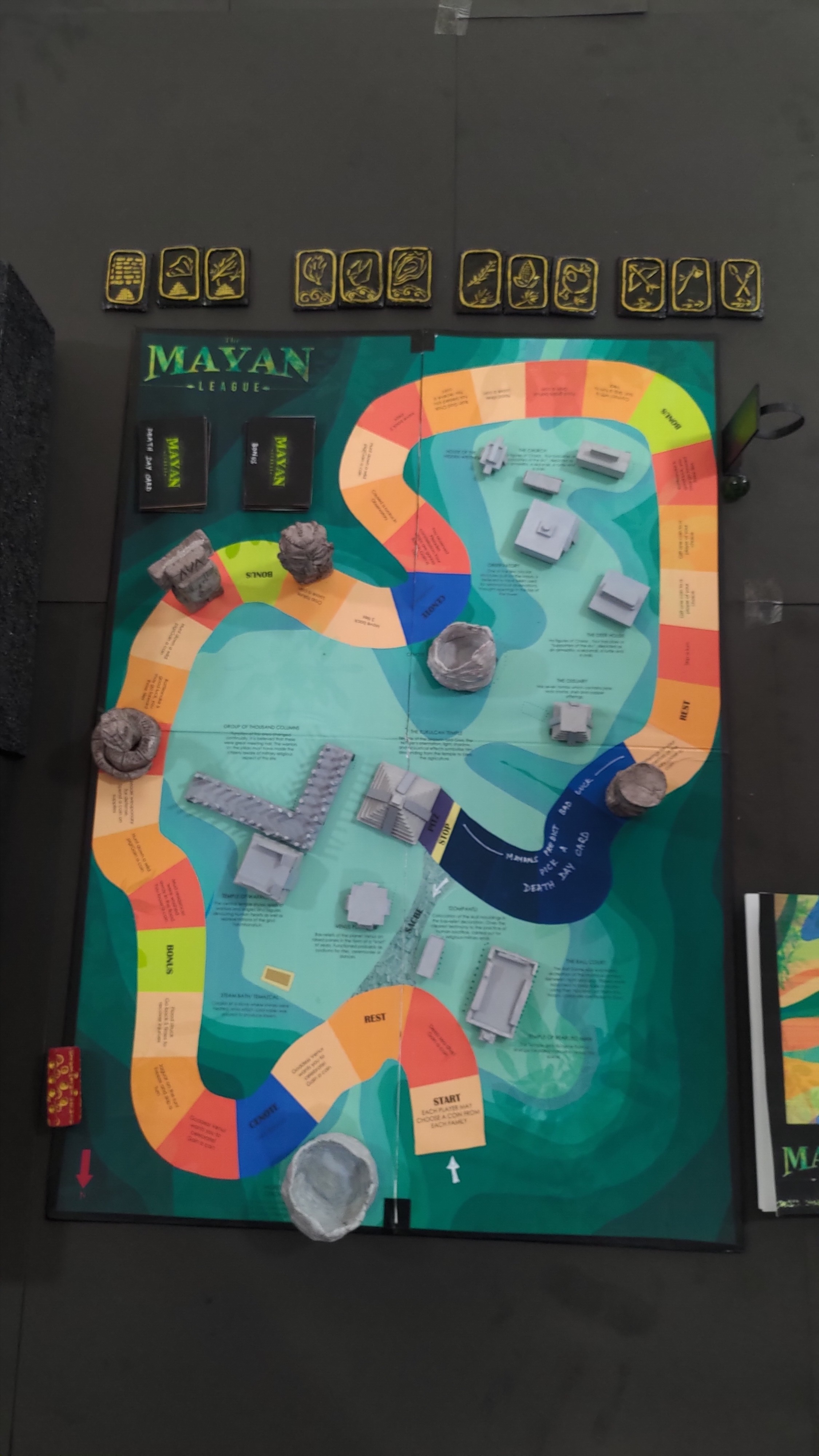 Instead of creating a board game that merely “travels back in time,” we aimed to build an immersive world, one that feels alive, and discoverable. The game introduces players to Mayan architecture, rituals, daily life, astronomy, and mythology through spatial movement across a landscape inspired board.