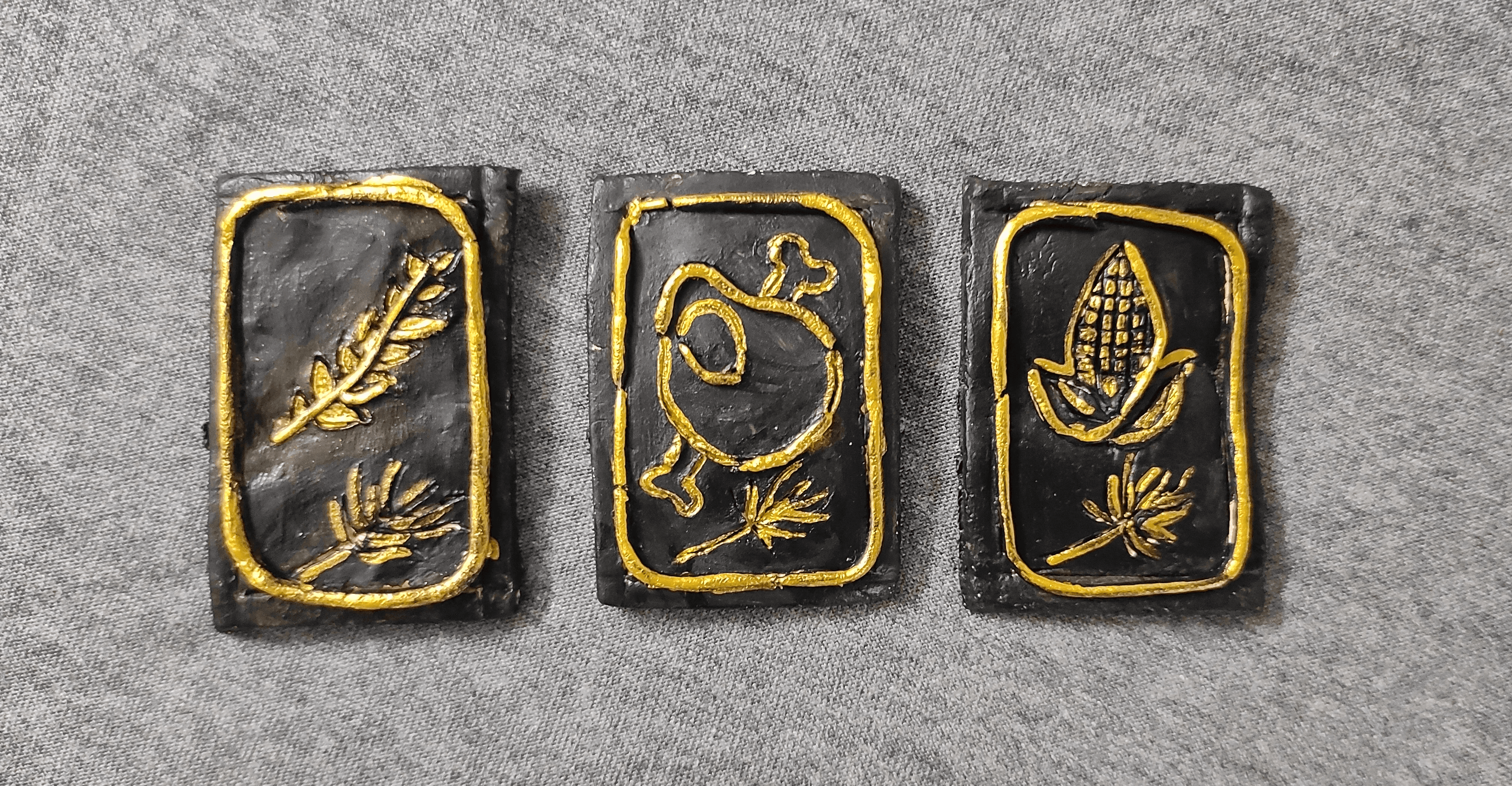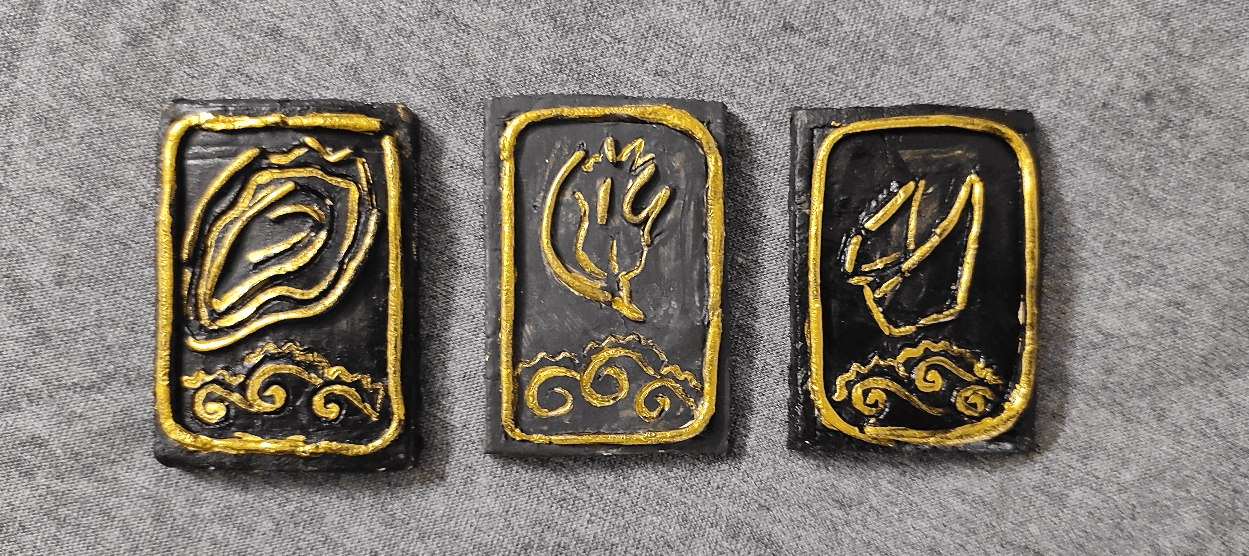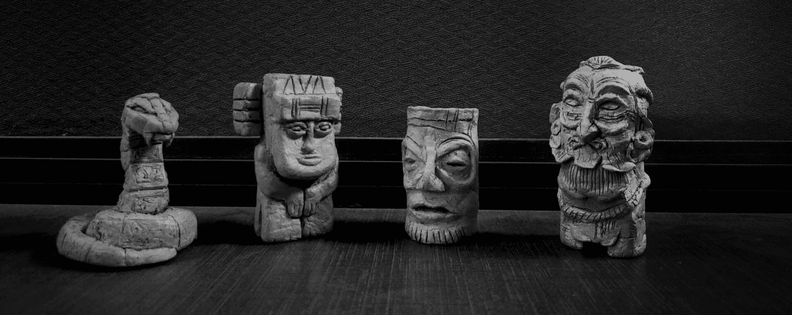 They were conceived as miniature stone figures, inspired by temple carvings, ritual sculptures, and Mesoamerican iconography. Each form carries distinct structures to subtly differentiate the two civilisations while maintaining a unified material language.