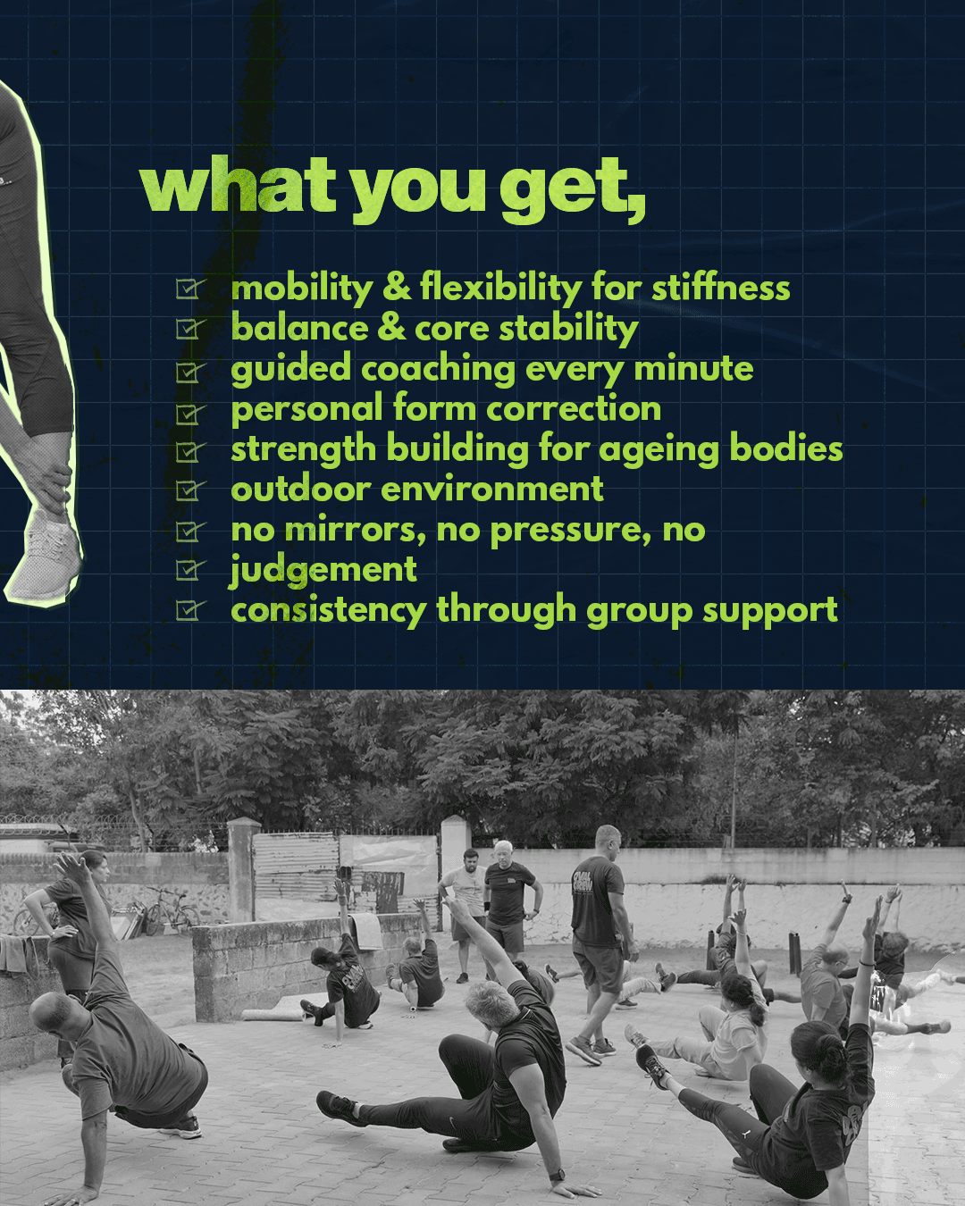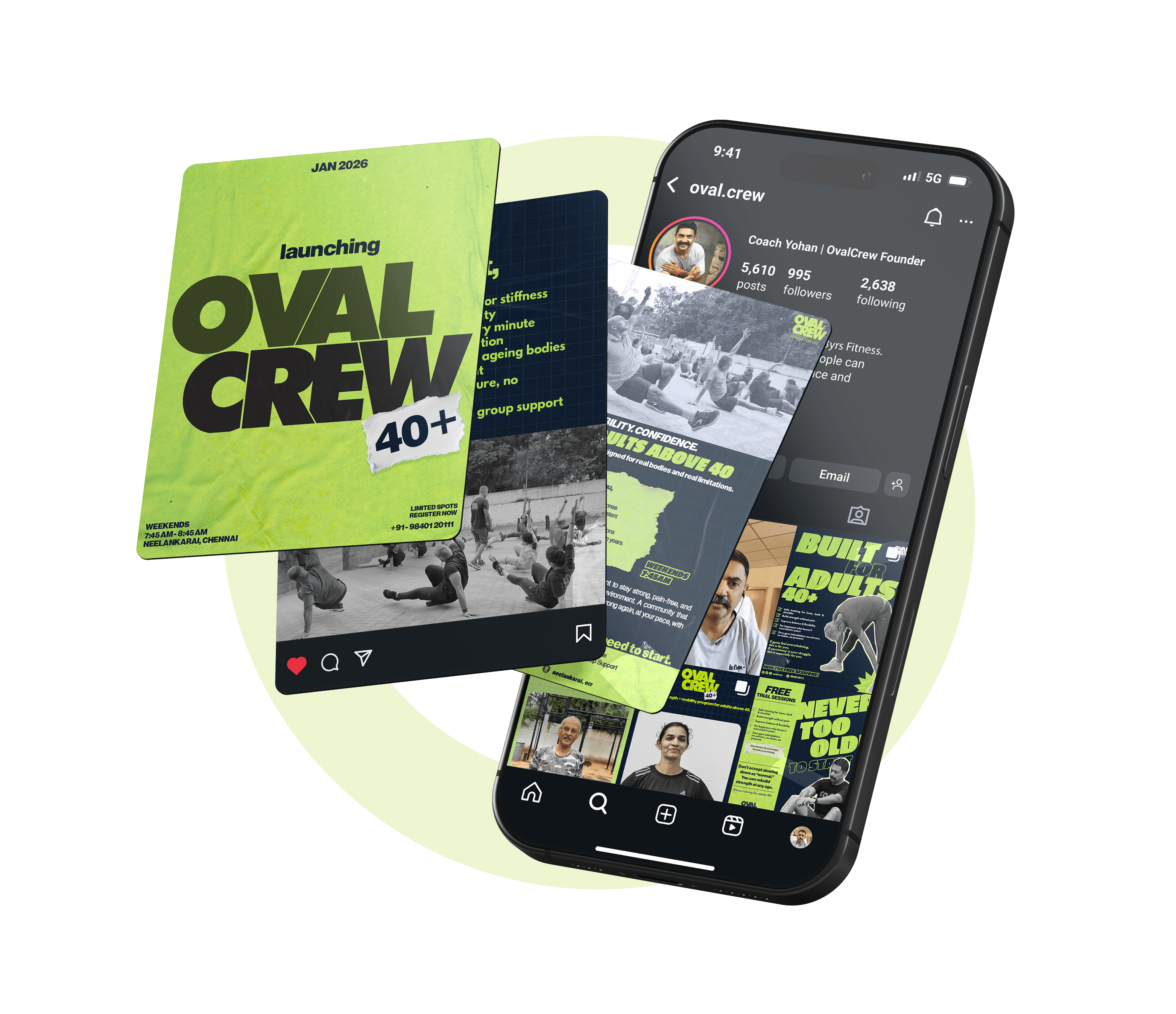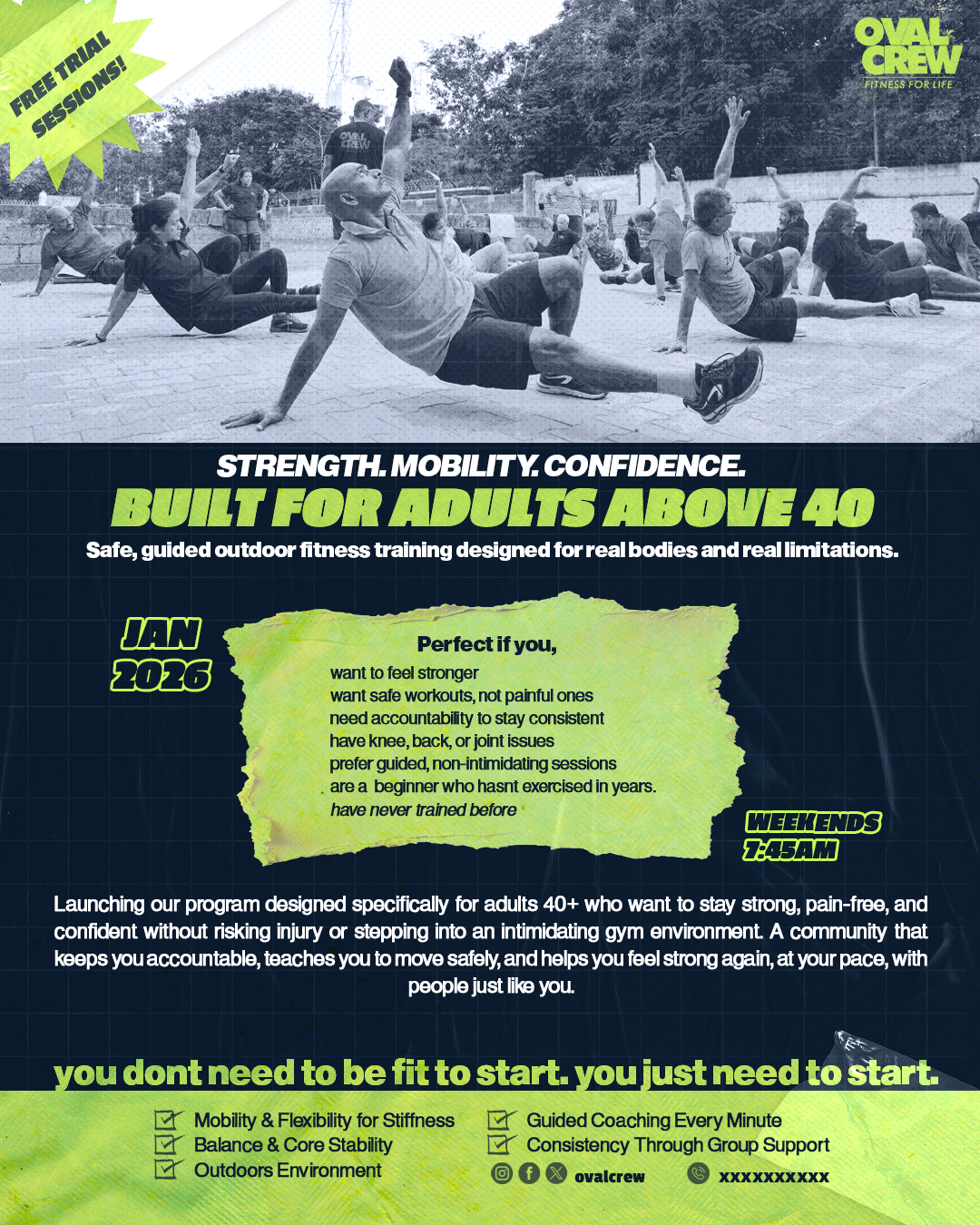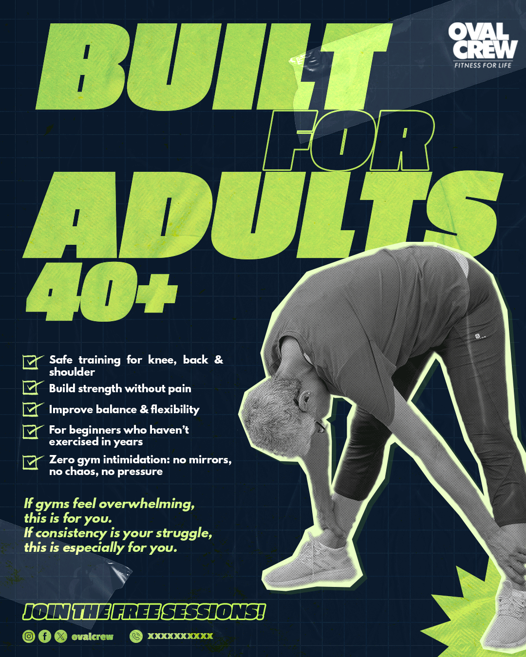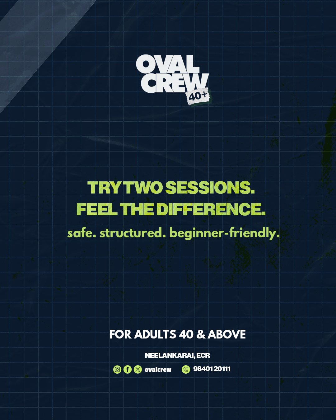 Oval Crew 40+ is a fitness initiative designed specifically for individuals aged 40–65, addressing concerns around joint safety, consistency, recovery, and motivation. The program was built around real audience insights, emphasizing injury prevention, community support, and beginner-friendly structured training.